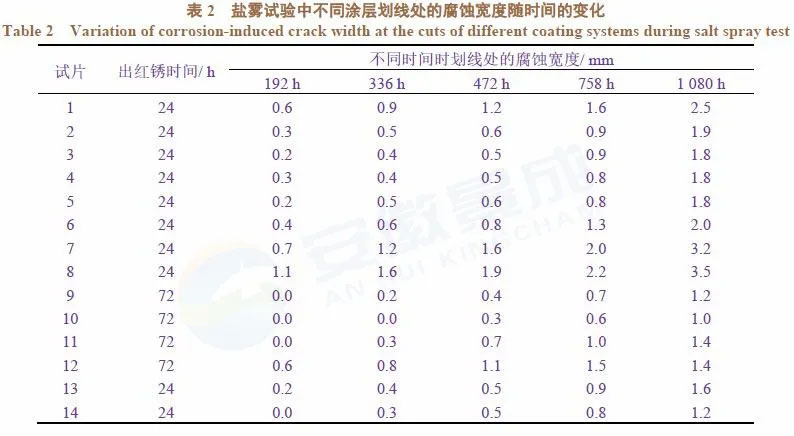 本文制備了如表1所列的14種膜厚的試片(部分按鹽霧試驗(yàn)要求劃上交叉線)來考察涂層的性能,其中1−8為靜電噴涂粉末面漆,9−12為靜電噴涂粉末底漆+粉末面漆,13為一般溶劑型防腐涂裝,14為溶劑型重防腐涂裝。