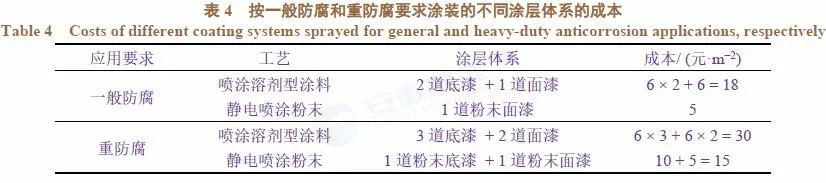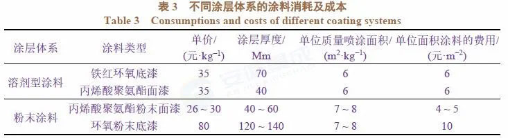 表3列出了在涂層厚度滿足技術(shù)要求的基礎(chǔ)上按理論計(jì)算的每平米施工費(fèi)用。