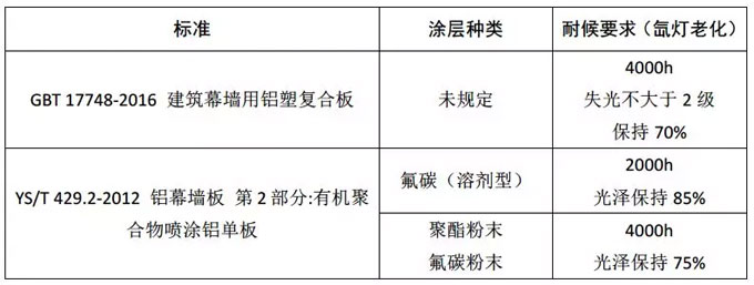可以看出一體板的這些地方標準,相對來說弱化或規避了涂層耐候性的指標,而且未明確不同涂層種類的差別,一刀切的規定大約在1000~1500h的耐候性。這個指標很像多彩漆和氟碳漆的耐候性之間找了一個平衡點,其實主要原因在于我們現在定標準很多時候必須平衡參與的多個廠家的建議和利益,因此指標往往會折中處理。
